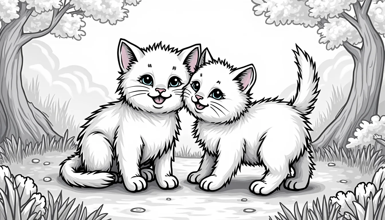 Cena com dois gatos brincando com um novelo de lã, em um desenho para colorir com traços lúdicos e elementos adicionais.