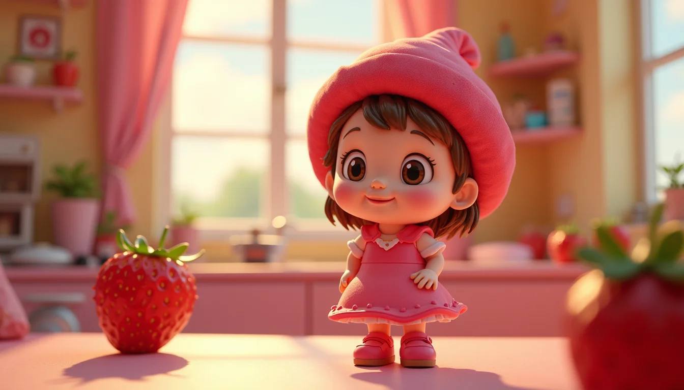 Desenho detalhado da Moranguinho com seu chapéu de chef, em uma cozinha com utensílios, ideal para atividades de colorir.