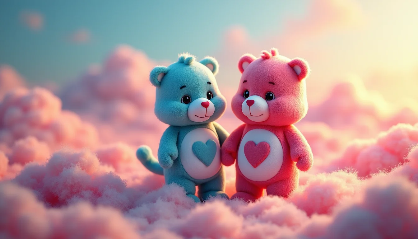 Cena com vários Ursinhos Carinhosos em volta de um arco-íris, com traços suaves e um fundo levemente esboçado.